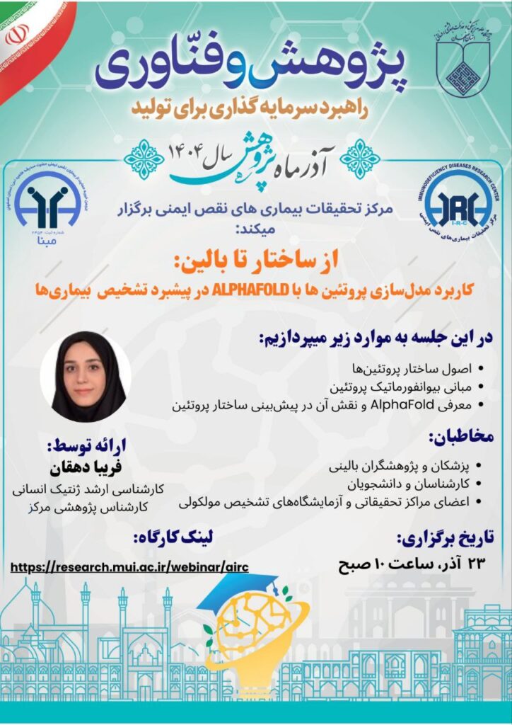 کارگاه آموزشی با عنوان: از ساختار تا بالین؛ کاربرد مدل‌سازی پروتئین‌ها با AlphaFold در پیشبرد تشخیص بیماری‌ها
